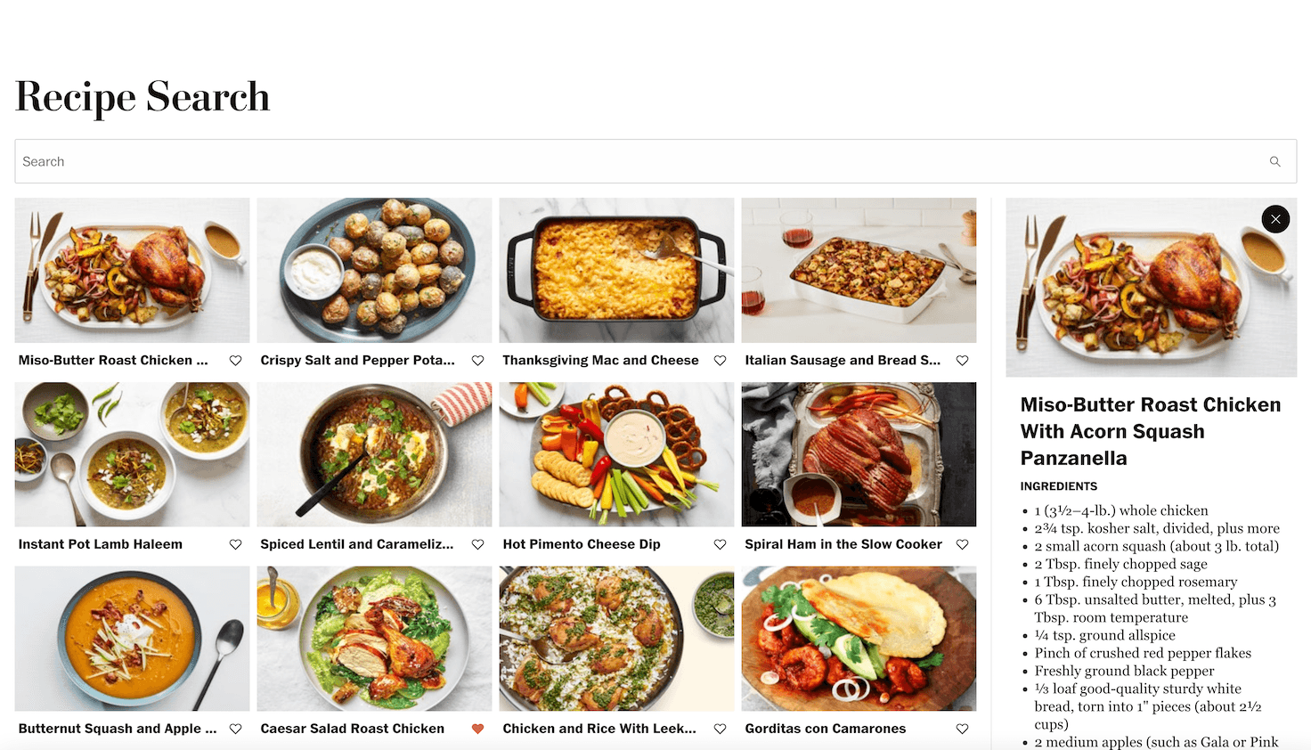 The RecipeCard contains an image, title, and favorite toggle button. It uses css grid and the UI Kit spacing constants to arrange these elements. With both the card as well as the favorites toggle being clickable it's necessary to include an invisible button as a sibling for both elements to remain interactive and accessible. Finally, a local storage hook is used to store any clicked favorites and persist them between visits.