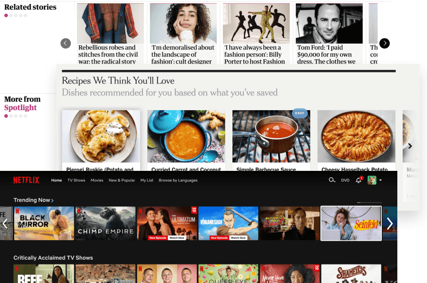 In simple terms, a carousel is a type of container that displays a sequence of items, which can be interacted with by clicking or swiping—much like a deck of cards or an old-fashioned slide projector – ie a “carousel”. Carousels are an extremely common UI pattern and it’s likely you’ve come across various instances of them across the web. Many websites make use of carousels— from news publishers and streaming platforms to e-commerce sites, recipe blogs and cloud-based tools.