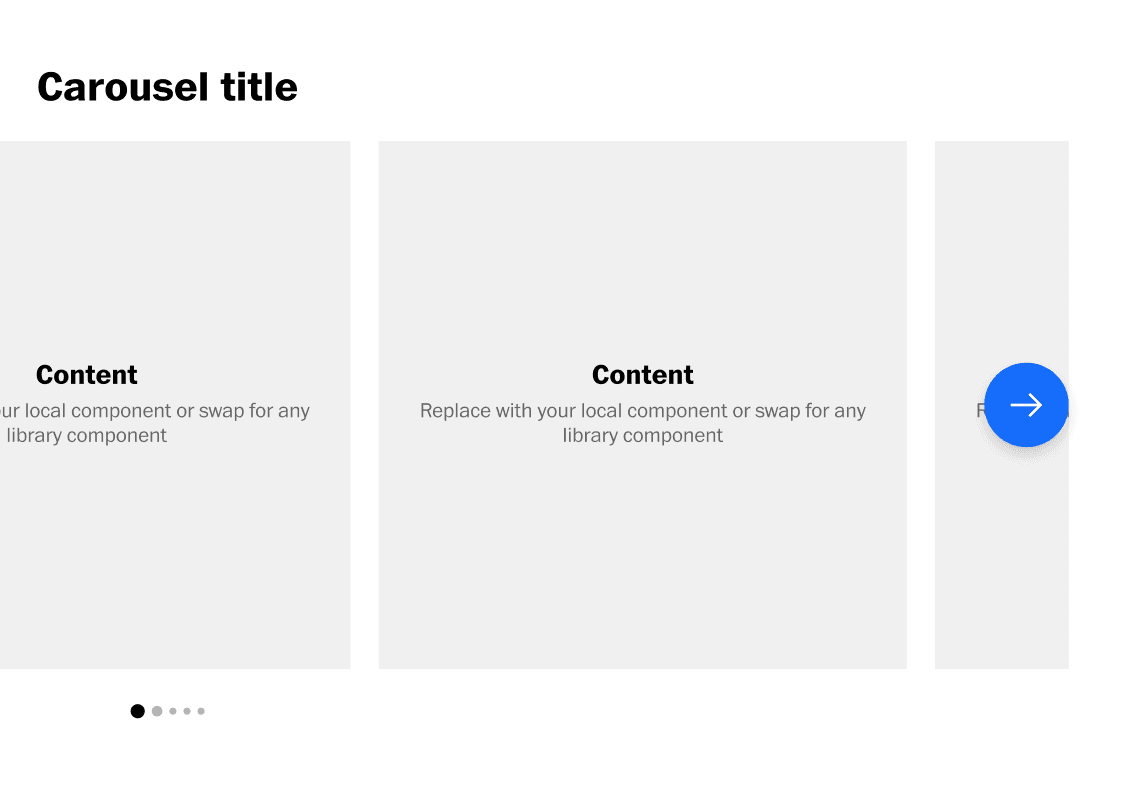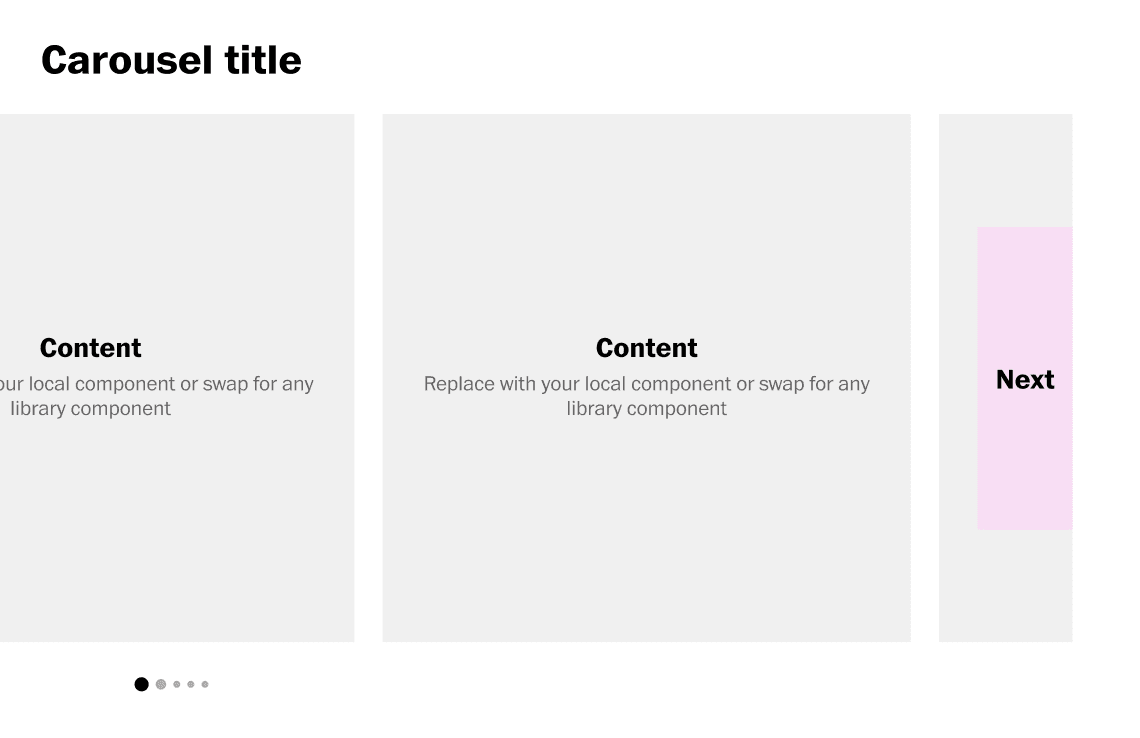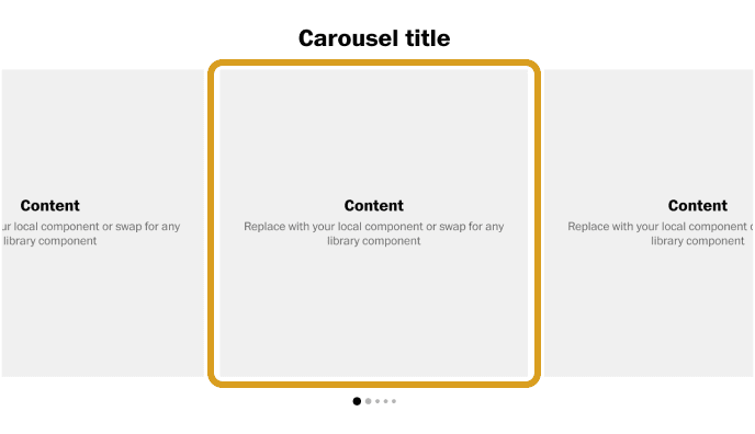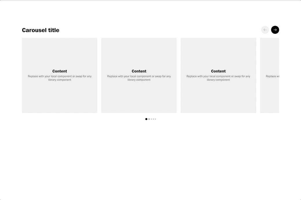 Combined with Figma’s “swap instance” feature,⬦Carousel offers several methods to customize the appearance of key UI elements such as content and controls. Out of the box, the component ships with placeholder elements (eg, “slots”) that can be replaced with your own, unique designs— all without ever detaching the component from our component library.