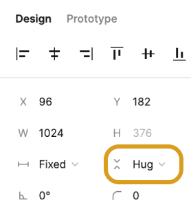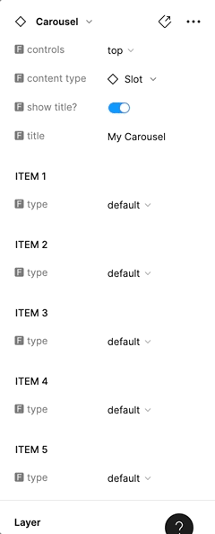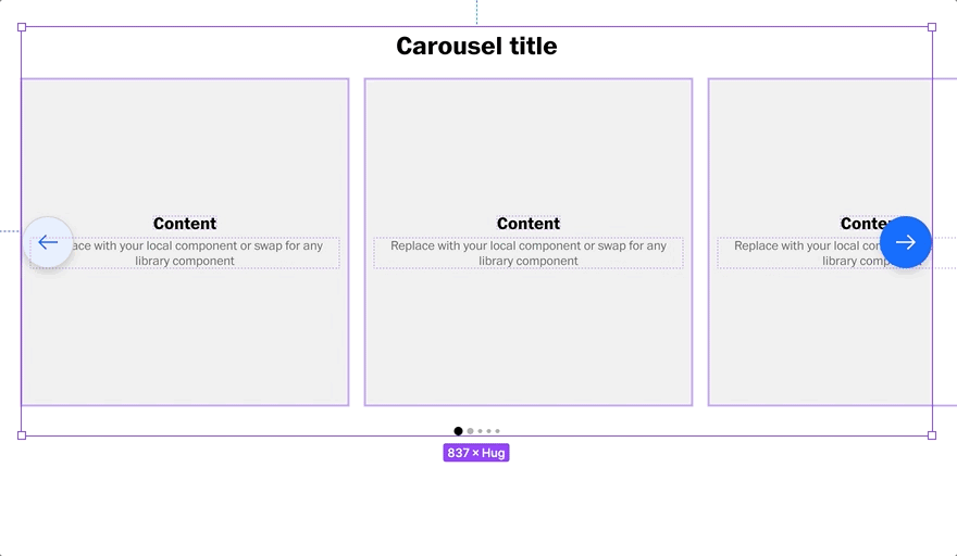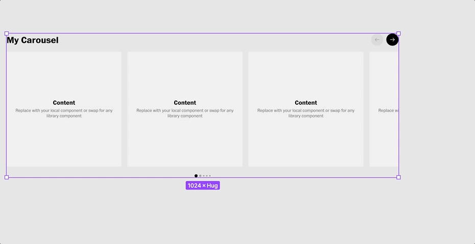 Using Figma’s Auto Layout feature, we can set the vertical dimension of ⬦Carousel to “hug” its contents. This means the height of the carousel is determined by the content nested within it, and will adapt its height accordingly.